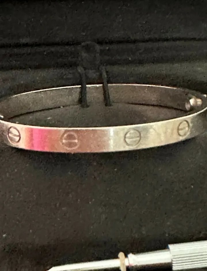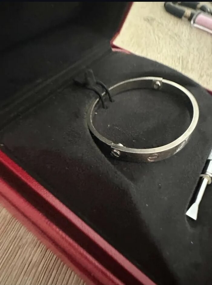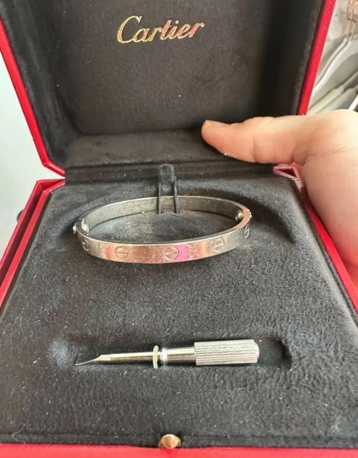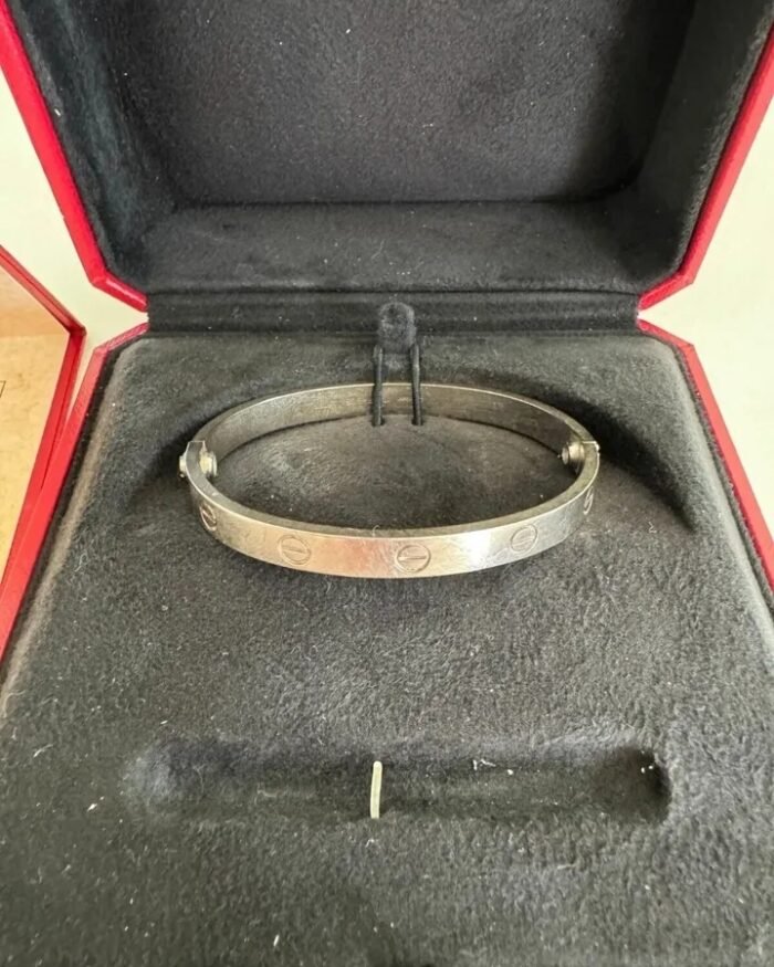 Apportez une touche d’élégance intemporelle à votre poignet avec ce bracelet Cartier Love en or blanc 18 carats, taille 17, authentique et en excellent état. Symbole d’affection et de raffinement, ce jonc ovale épouse parfaitement le poignet tout en offrant confort et style.