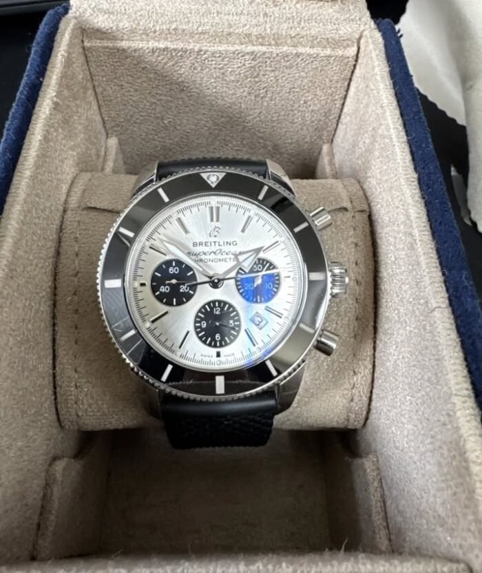 Livrée avec boîte d’origine, manuel et papiers, cette Superocean Heritage B01 Chronographe représente un choix idéal pour les collectionneurs et amateurs d’horlogerie de luxe à la recherche d’un modèle complet et authentique.
