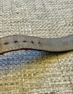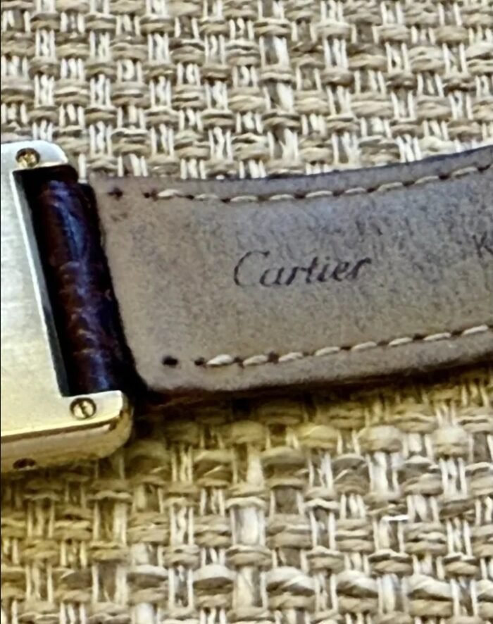 Son bracelet en cuir Cartier d’origine avec boucle dorée,
