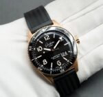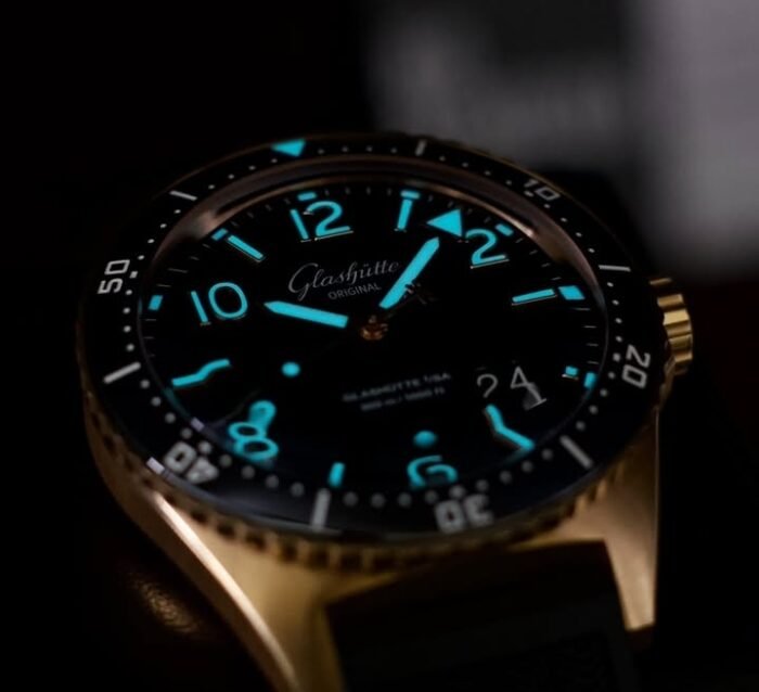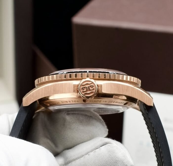 Découvrez la Glashütte Original SeaQ Panorama Date Réf. 1, une montre de plongée alliant élégance vintage et technologie horlogère moderne. Lancée en 2019, cette pièce en or rouge se distingue par son cadran noir profond et son affichage Panorama Date à 4h30, offrant lisibilité et raffinement.