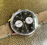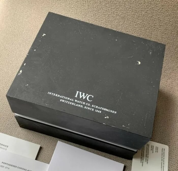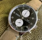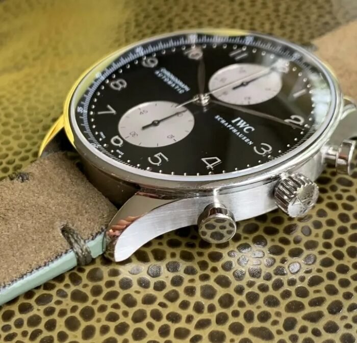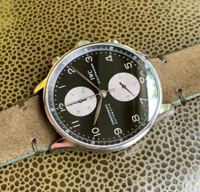 Superbe IWC Portugieser Chronographe réf. 371404, cadran noir reverse panda. Livrée avec boîte et papiers. Excellent état, très légères traces d’utilisation, bracelet daim de qualité (fabriqué en Allemagne).