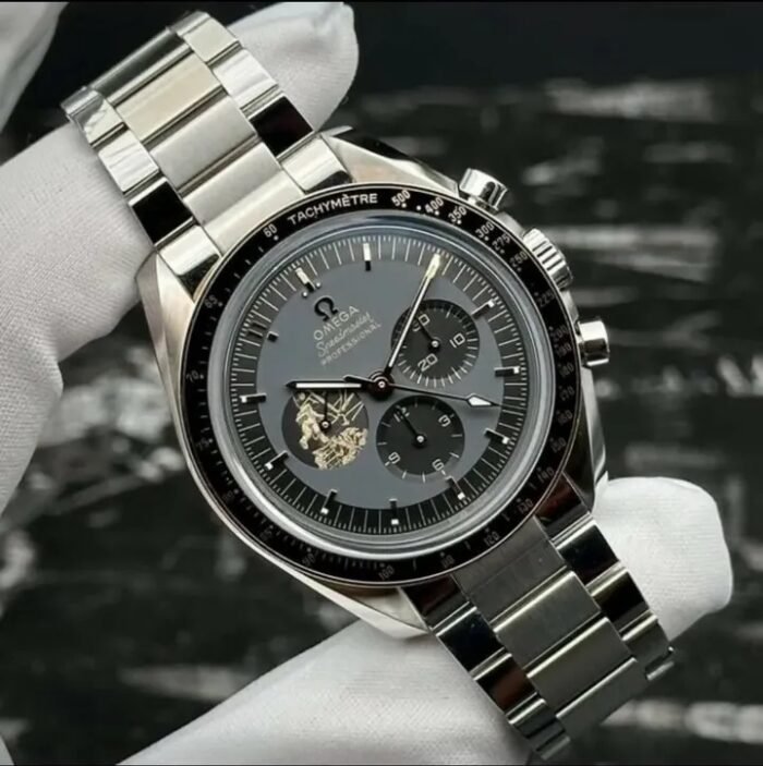 La montre est dotée d’un boîtier de 42 mm en acier inoxydable avec une lunette polie en or Moonshine 18 carats. La lunette est en céramique noire polie [ZrO2] et est dotée d’une échelle tachymétrique OMEGA Ceragold. Le cadran verni gris et noir est orné d’index et d’aiguilles en or Moonshine 18 carats, à l’exception de l’aiguille centrale des secondes du chronographe, revêtue de PVD or Moonshine. Un index unique est positionné à 11 heures, tandis qu’un sous-cadran distinctif en or Moonshine 18 carats à 9 heures arbore une image gravée au laser de Buzz Aldrin descendant sur la surface lunaire.