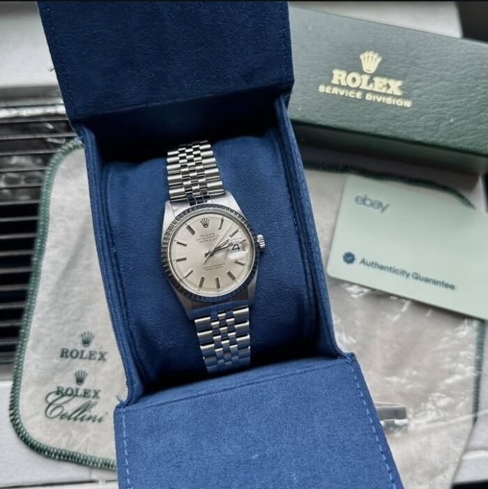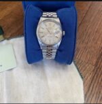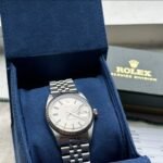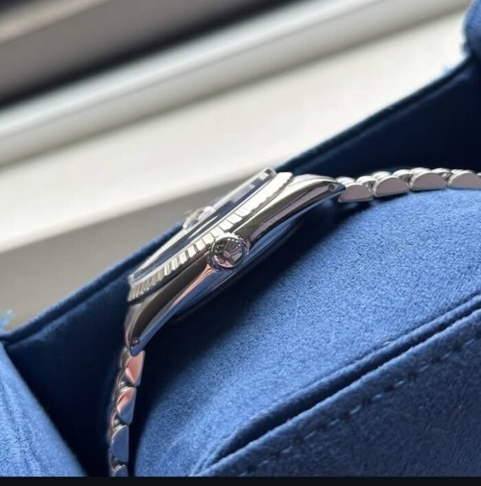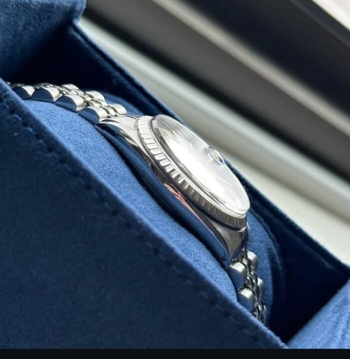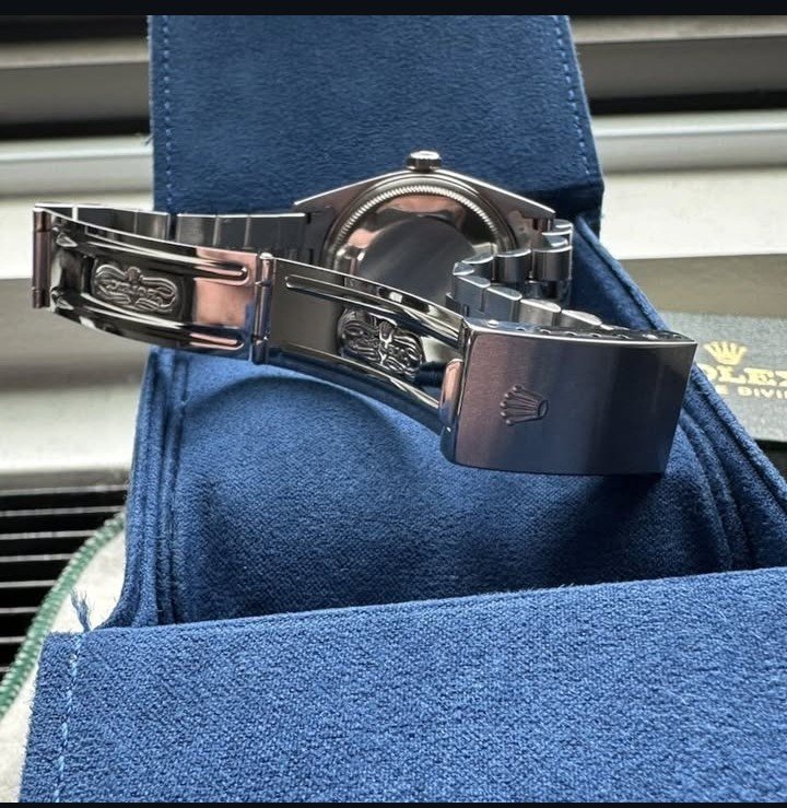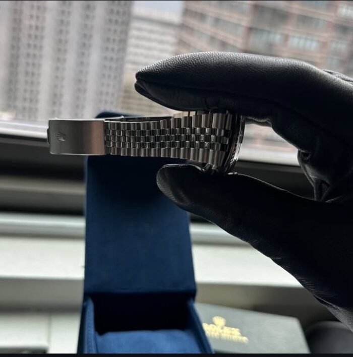 Le cadran argenté à effet Sunburst reflète subtilement la lumière, offrant une profondeur visuelle unique. Associé à la lunette cannelée et au bracelet Jubilé, ce modèle incarne parfaitement le style Rolex intemporel.