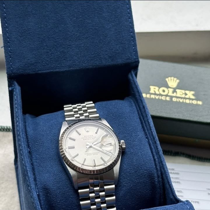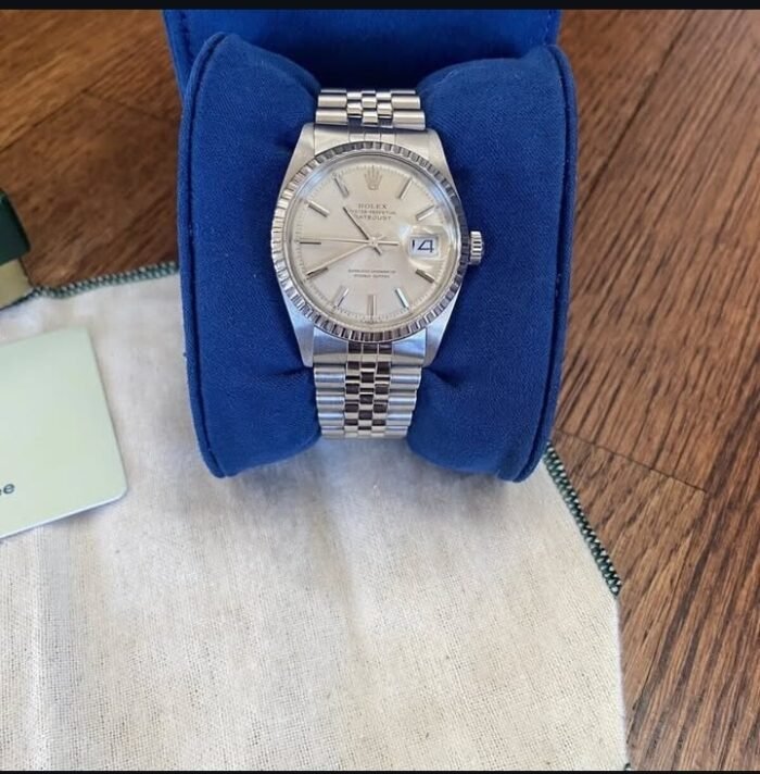 La Rolex Datejust réf. 1603 est une montre-bracelet emblématique, alliant élégance intemporelle et robustesse horlogère. Avec son cadran argent Sunburst, sa lunette cannelée en or blanc et son boîtier de 36 mm en acier inoxydable Oystersteel, ce modèle est un classique apprécié des collectionneurs et passionnés de montres vintage.