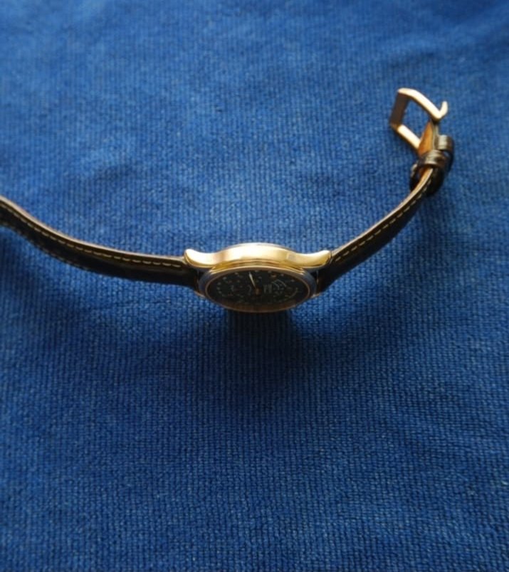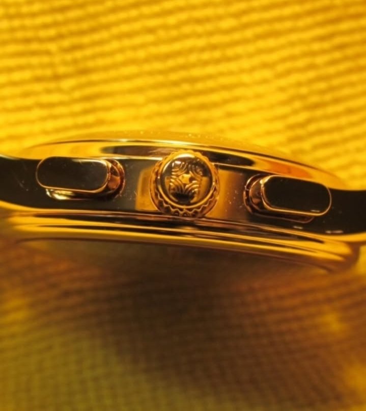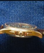 Cadran : Noir, aiguilles en or rose, index arabes et triangulaires, échelle tachymétrique